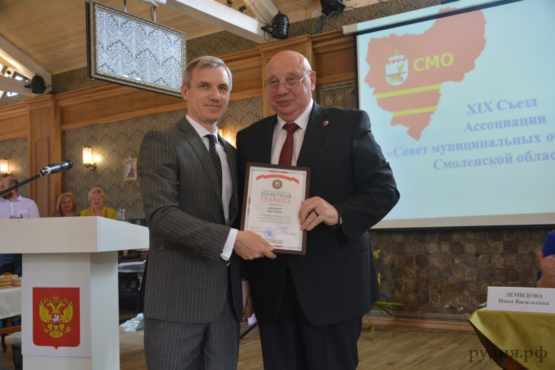 В начале пленарного заседания перед участниками съезда выступил Губернатор Смоленской области Василий Николаевич Анохин, который рассказал об итогах работы, перспективах развития региона и планах на будущее, а также вручил награды. Почетная грамота Правительства Смоленской области за многолетний добросовестный труд и значительный вклад в развития местного самоуправления в Смоленской области вручена Юрию Ивановичу Ивашкину.
