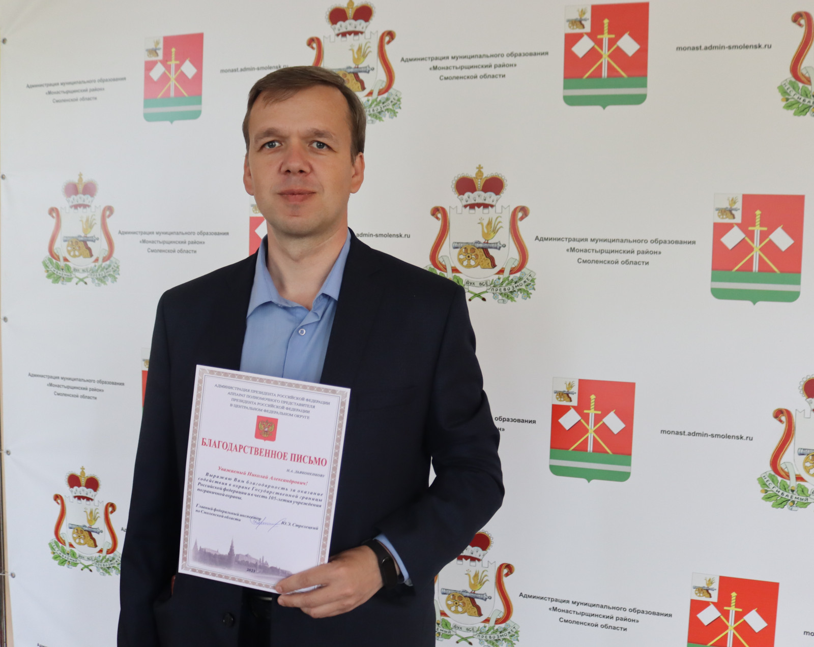 За оказание содействия в охране Государственной границы Российской Федерации и в честь 105-летия учреждения пограничной охраны заместитель Главы муниципального образования «Монастырщинский район» Смоленской области Николай Александрович Дьяконенков был награжден Благодарственным письмом Аппарата полномочного представителя Президента Российской Федерации в Центральном федеральном округе.