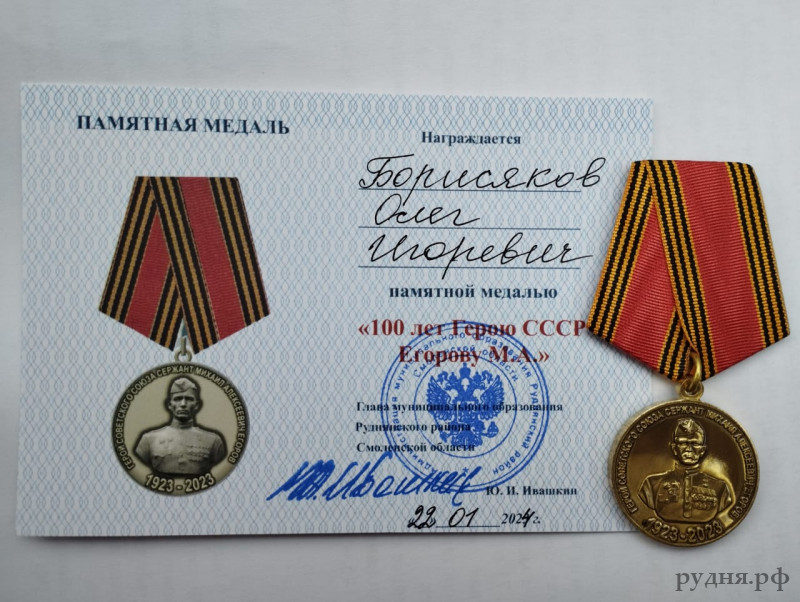 Нашему земляку, участнику СВО вручена памятная медаль «100-лет Герою Советского Союза М.А. Егорову»