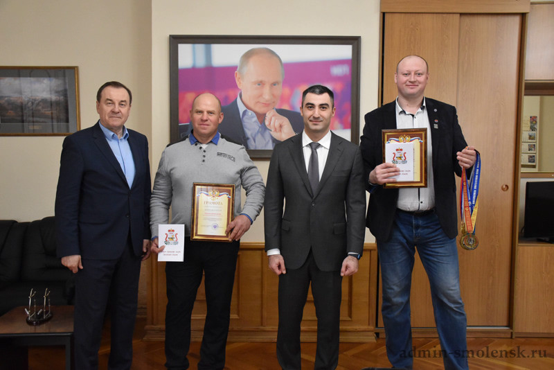 Сегодня заместитель Губернатора Смоленской области Станислав Вячеславович Дзасохов вручил денежное поощрение Администрации Смоленской области Виктору Колибабчуку за показанные высокие спортивные результаты: 2 место на чемпионате мира в Сан-Паулу (Бразилия) и 1 место на чемпионате России в Уфе, а так же тренеру спортсмена Александру Михайловичу Усову.