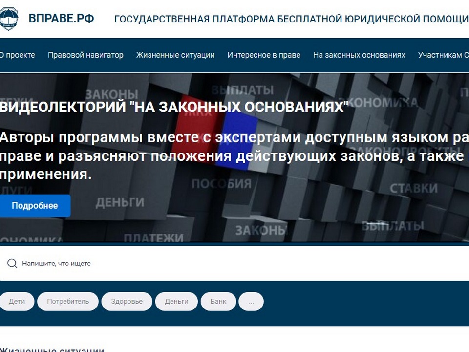 Одним из основных компонентов системы является единый портал правового просвещения и бесплатной юридической помощи «ВПРАВЕ.РФ» , который содержит подробную и исчерпывающую информацию о том, где, у кого и когда можно получить правовую помощь при различных жизненных ситуациях. Для удобства смолян все жизненные ситуации сгруппировали по категориям и подкатегориям.