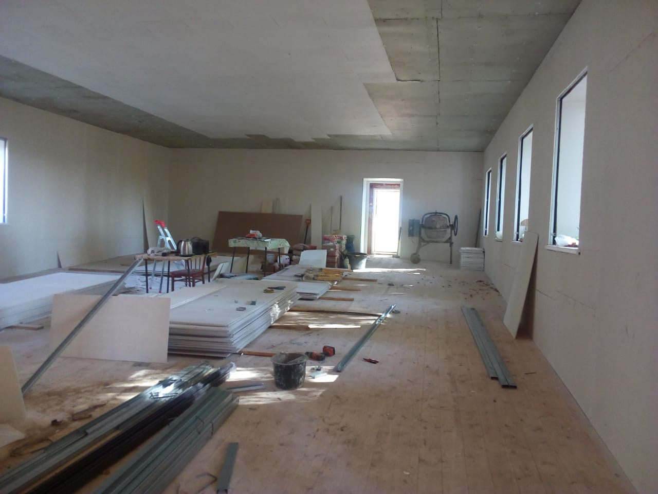 Завершена покраска фасада, устройство и покраска фронтонов. Идет обшивка стен гипсокартонном, приступили к устройству потолка. Подрядчиком выступает ООО «МОНТАЖ 67».