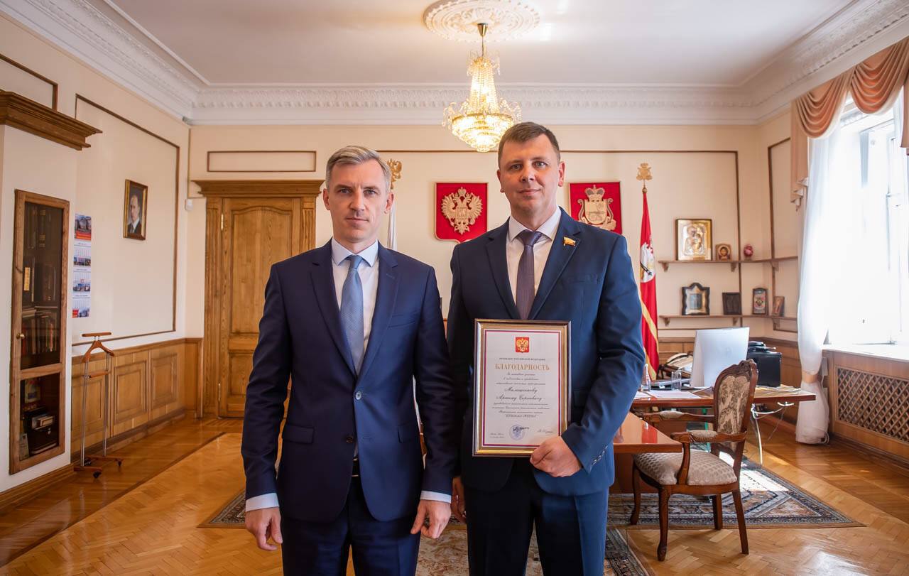 Временно исполняющий обязанности Губернатора Смоленской области Василий Анохин исполнил поручение Президента Владимира Путина и в торжественной обстановке передал благодарность Президента Российской Федерации Артему Малащенкову.