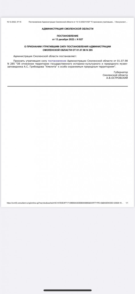 Ранее в социальных сетях разместили документ, в котором признавалось утратившим силу постановление 1998 года «Об отнесении территории государственного историко-культурного и природного музея-заповедника А.С. Грибоедова «Хмелита» к особо охраняемым природным территориям».