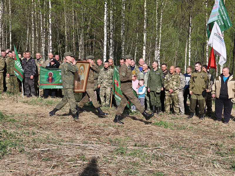 У Вахт Памяти на Смоленщине есть свои глубокие традиции. Одна из них – проведение торжественных построений возле времянки под православным крестом, куда поисковики приносят останки бойцов и где каждый вечер зажигаются поминальные свечи. И все это проходит перед духовной покровительницей поисковиков – иконой Божией Матери «Взыскание погибших»