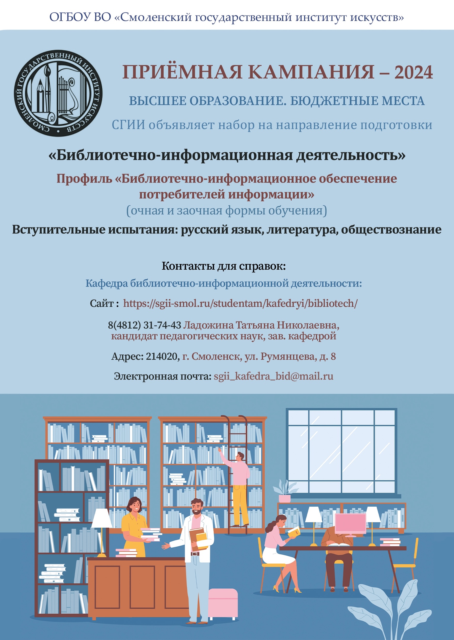 Уважаемые абитуриенты! Смоленский государственный институт искусств приглашает учащихся старших классов школ Рославльского района принять участие в Дне открытых дверей, который проводится 23 марта 2024 г. в 11-00 часов.