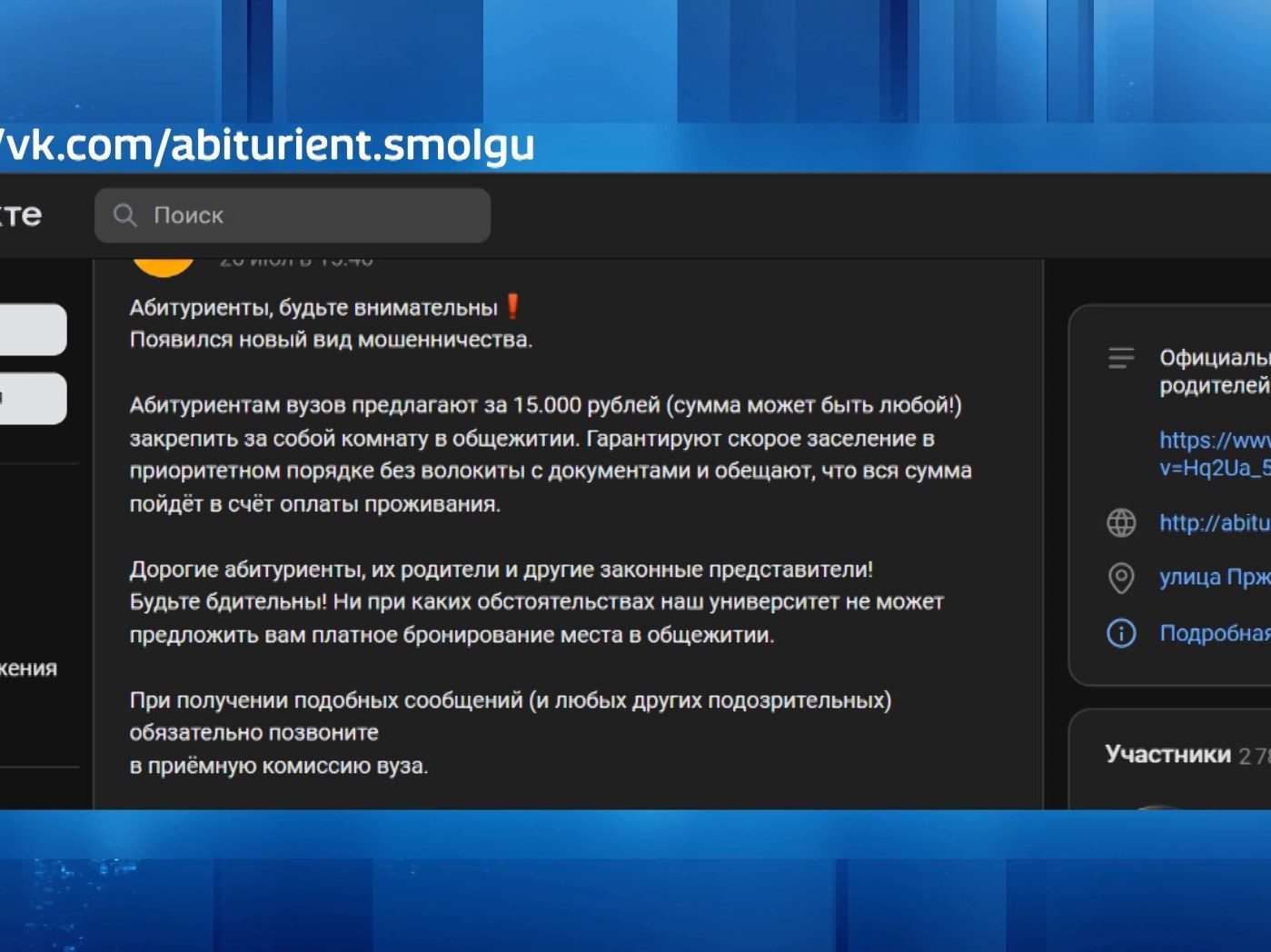 Как рассказали в группе вуза в соцсетях, абитуриентам предлагают за 15 тысяч рублей или любую другую сумму «забронировать» за собой комнату в общежитии. Якобы, в случае оплаты гарантируется скорое заселение в приоритетном порядке без волокиты с документами. Деньги, по словам злоумышленников, поступят в счет оплаты проживания. В вузе подчеркнули, что университет ни при каких обстоятельства не может предложить платное бронирование места в общежитии. При получении подобных сообщений и других подозрительных предложений, абитуриентов и их законных представителей просят сообщить об этом в приемную комиссию вуза.