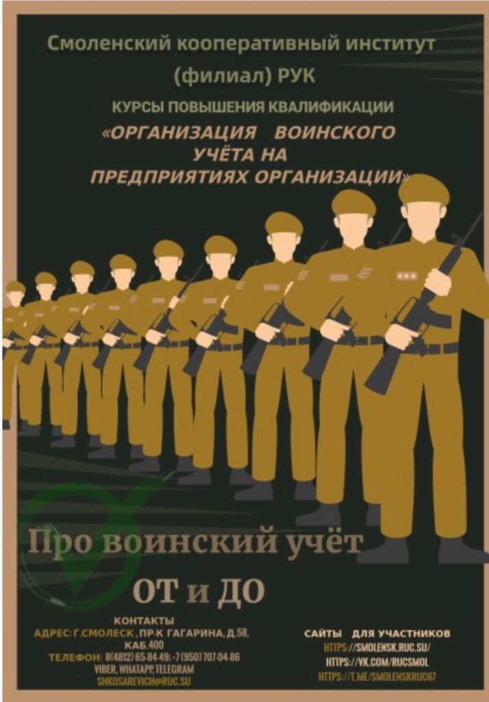 Смоленский кооперативный институт (филиал) Российского университета кооперации объявляет набор на курсы повышения квалификации по программе подготовки «Организация воинского учёта на предприятиях, в организациях»