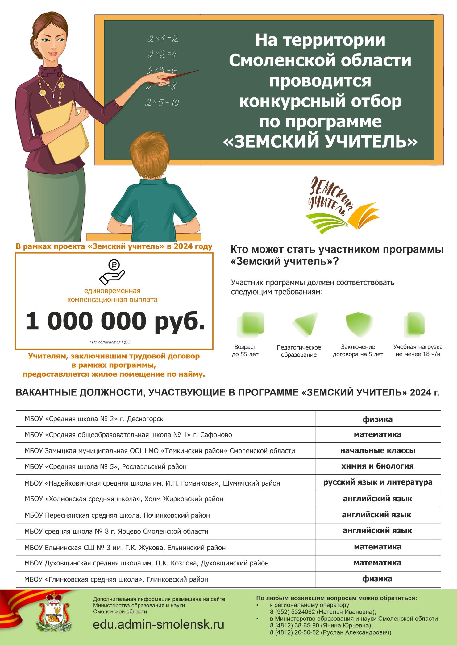 В 2024 году планируется привлечь 11 учителей в следующие общеобразовательные организации Смоленской области: