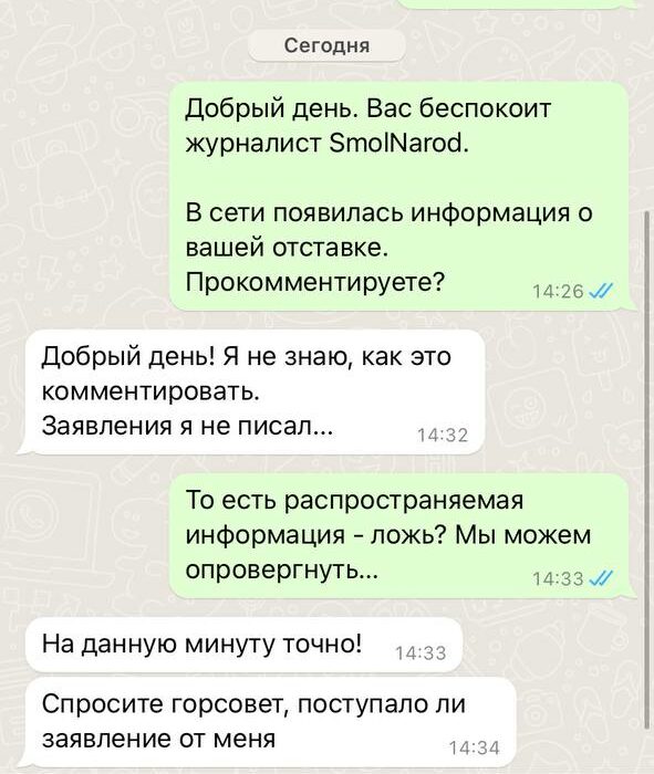 Редакция SmolNarod обратилась за комментарием к Андрею Борисову. 5 июня появилась информация о том, что градоначальник уходит в отставку. Ранее ходили слухи и о том, что в конце мая он написал заявление о сложении полномочий.