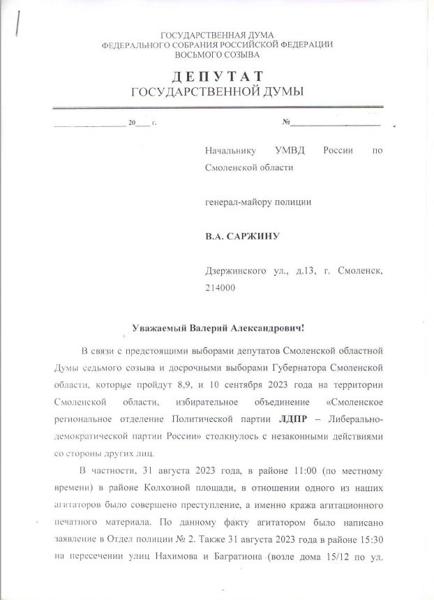 Депутат Госдумы Сергей Леонов в своих соцсетях рассказал, что на Колхозной площади в Смоленске у активистки ЛДПР в ходе пикета украли сумку с агитационными газетами.