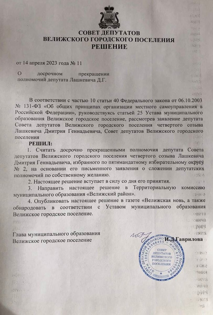 Позже Дмитрий Лашкевич принёс смолянам и велижанам свои извинения. Однако, как следует из решения горсовета четвёртого созыва смоленского райцентра (см. документ ниже), раскаяний ему самому показалось мало, и он письменно заявил о сдаче мандата — по собственному желанию.