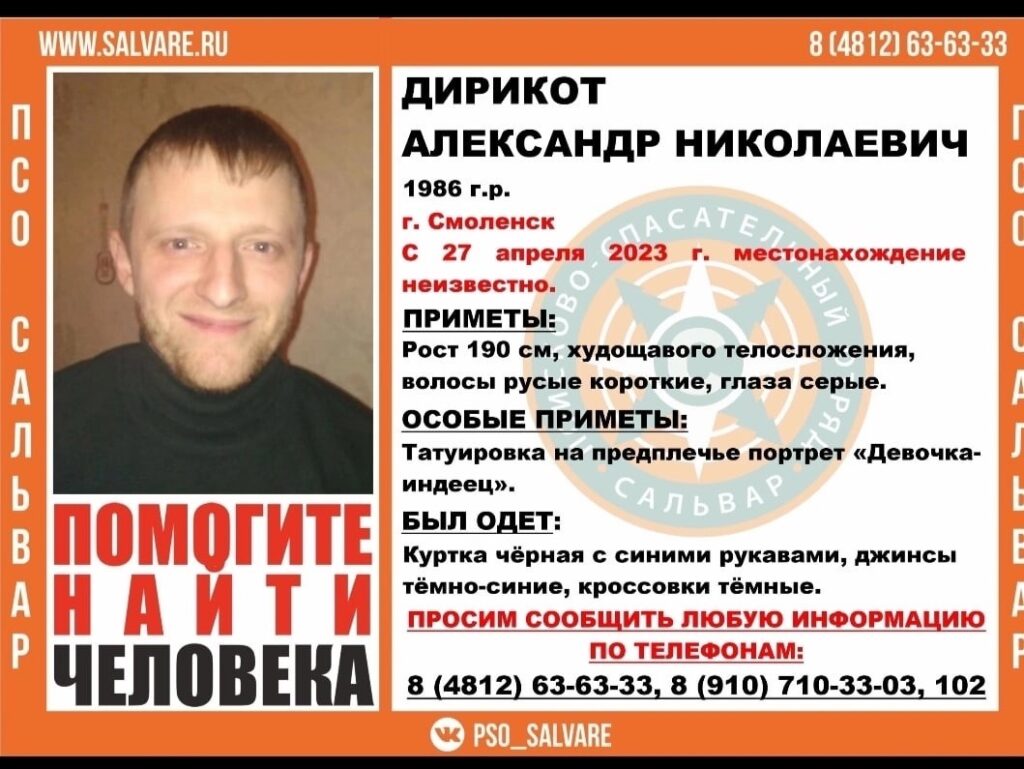 В Смоленске пропал высокий мужчина с татуировкой девочки-индейца на предплечье. Александр Дирикот 27 апреля вышел из дома по улице Николаева и до сих пор не вернулся, сообщает смоленский поисково-спасательны отряд «Сальвар».