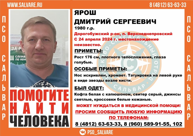 В поселке Верхнеднепровский Дорогобужского района пропал 44-летний Дмитрий Сергеевич Ярош. О местонахождении мужчины ничего не известно с 24 апреля, он может нуждаться в медпомощи, сообщает ПСО «Сальвар».