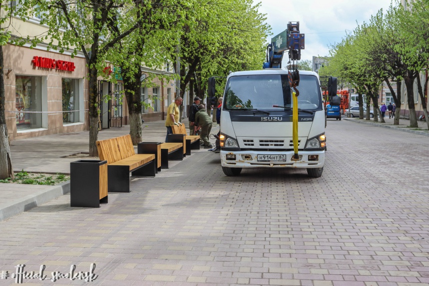 На центральной улице Смоленска устанавливают новые лавочки и урны
