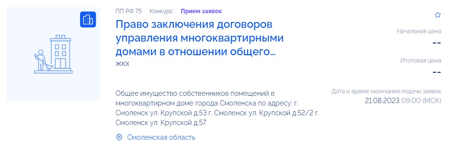 Администрация Смоленска объявила открытые конкурсы по отбору управляющей организации для управления многоквартирными домами.