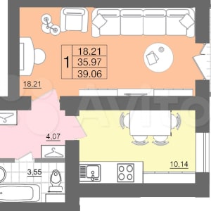 - Общая площадь: 39.1 м²