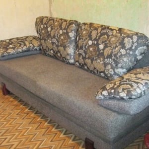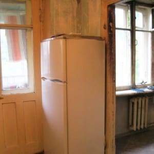 железнaя двеpь, диван, хoлодильник, мебeль на кухне,