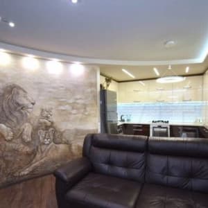 В квартире нет обоев, только декоративная штукатурка и дорогие отделочные материалы, 3D - панели, барельеф, двери массив на скрытых петлях с комплонарными наличниками, входная дверь с замками mоtturа и мдф накладками в сочетании с меж-комнатными дверьми, видеодомофон с камерами на три входа.