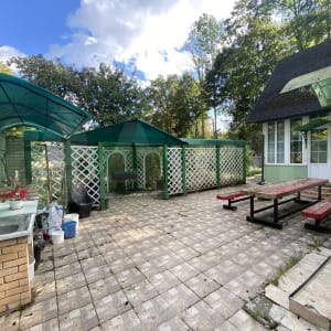 За домом Площадка, отделана плиткой, на ней Мангал с дровами Беседка и Летний стол для Трапезы на природе. Далее Баня с Бассейном, площадью 150 кв.м. На первом этаже: Парилка, Бассейн, С/у и Комната отдыха с Камином и ТВ! На втором: Просторная жилая комната с балконом и мини-Кухней!